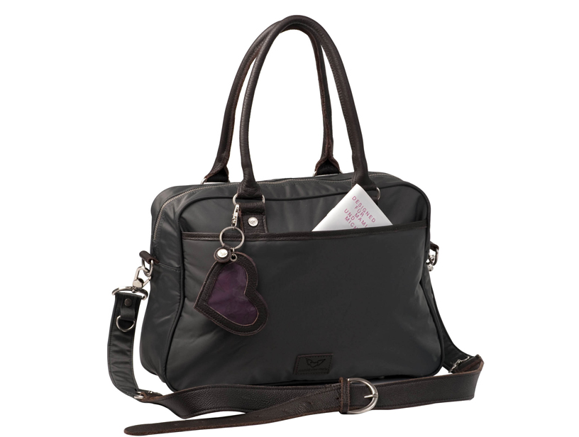 Die Bowlingbag „LILY“ im edlen graphitgrauen Nylon mit dunkelbraunen Lederdetails ist eine zeitlose Handtaschenform und ein Klassiker der petit amour Wickeltaschen.