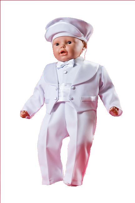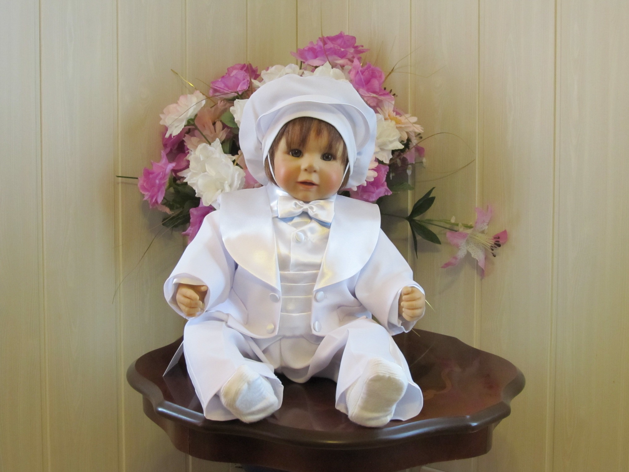 Edles und sehr zeitlos elegantes 6-teiliges Taufsmoking (Hosen, Hemd, Blazer, Weste, Fliege und Hut) in schneeweiß.