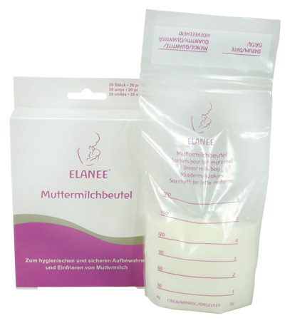 Zum hygienischen und sicheren Aufbewahren und Einfrieren von abgepumpter Muttermilch. In einem ELANEE Muttermilchbeutel können bis zu 180 ml. Muttermilch eingefroren und aufbewahrt werden. In tiefgefrorenem Zustand kann Muttermilch bis zu 6 Monaten gelagert werden. Elanee Muttermilchbeutel bestehen aus lebensmittelechtem, gefriergeeignetem Polyetyhylen, sind vorsterilisiert und haben einen doppelten Sicherheitsverschluss. Sie nehmen keine Gerüchte auf, garantieren optimale Haltbarkeit und sind mit einer Massangabe und einem Beschriftungsfeld versehen. Die Fette der Muttermilch lösen keinerlei Substanzen aus dem Material der Beutel aus.