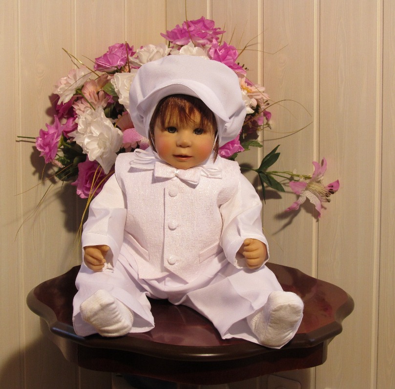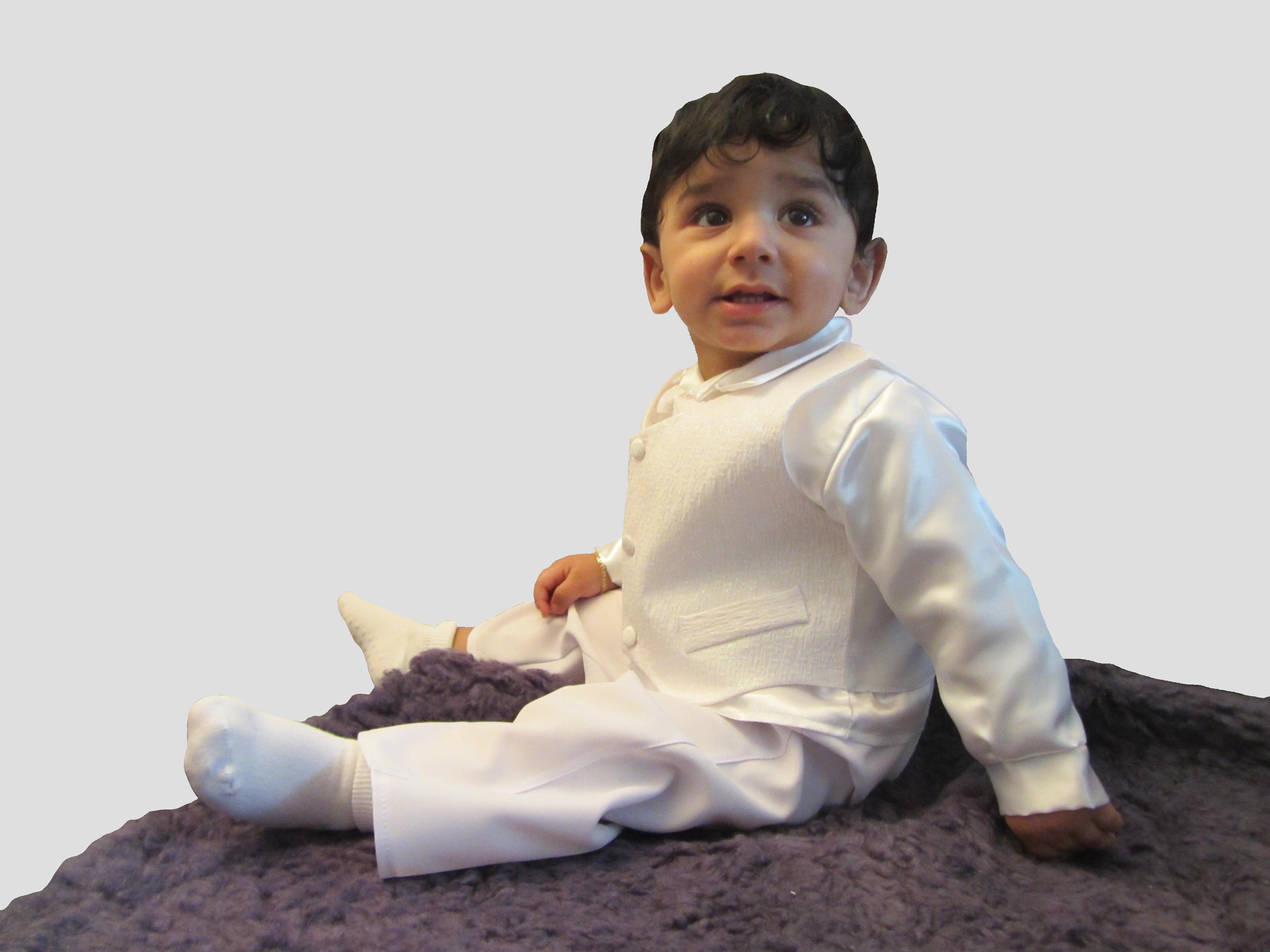Edler und sehr zeitloser eleganter 5-teiliger Taufanzug (Hosen, Hemd, Weste, Fliege und Hut) in schneeweiß Fabelhafter Taufanzug für den kleinen Charmeur damit der kleiner Schatz wie ein echter Prinz aussieht !!! Ausgezeichnete Verarbeitung, alles hervorragend aufeinander abgestimmt und von optimaler Qualität !!! Ideal für die Taufe, Kommunion, für jeden Festtag. Dezente und hochelegante Details, wie die Abschlüsse auf der Weste verleihen dem Anzug unvergleichliche Schönheit! Sehr leichte und total angenehme Stoffe. Die Hosen sind sehr bequem und mit Gummizug.