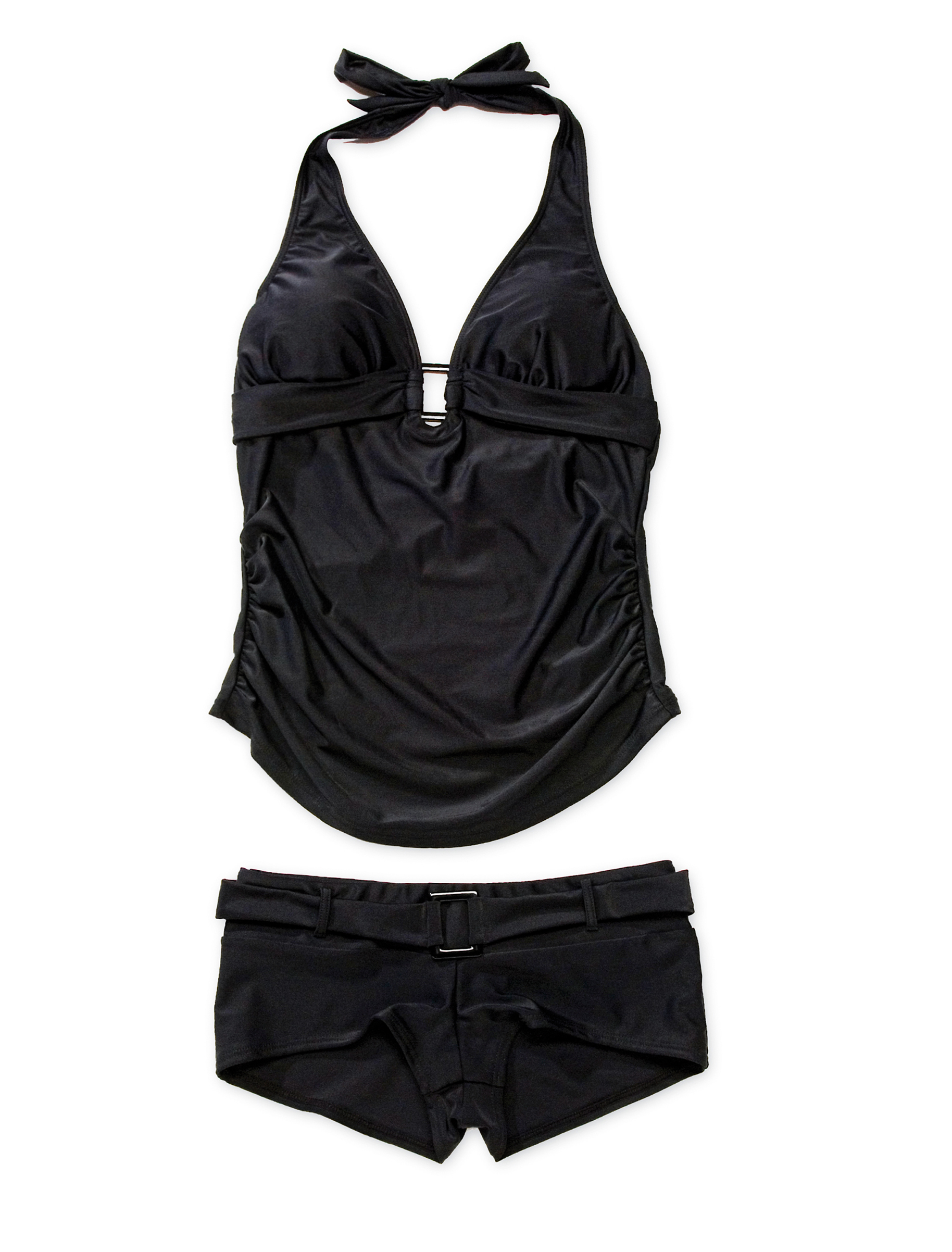 Eleganter Umstandstankini mit hochwertigen Schnallen, kunstvollen Fältelungen und Unterbauchshort mit Gürteldetail. Seitliche Raffungen umschmeicheln den Bauch, Cups sind ausgestattet mit vorgeformten und herausnehmbaren Schalen. Vorderteile des Umstandstankinis Sexy Black sind weich gefüttert und alle Materialien sind hochelastisch.