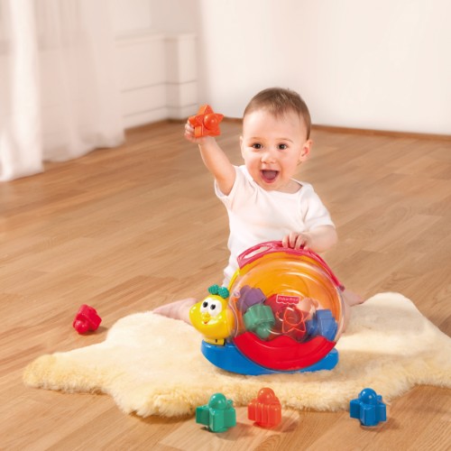 Ob die 10 bunten Blöcke auf die Schaukelbasis gebaut oder in den Schneckenhaus-Eimer sortiert werden, Babys haben dabei jede Menge Spaß. Hierbei wird auch das Formen-Verständnis geschult, denn Ihr Baby wird feststellen, dass nicht jeder die Bausteine durch alle Öffnungen des Schneckenhauses passt. Wird die Basis geschaukelt, erklingt eine schöne Musik.
