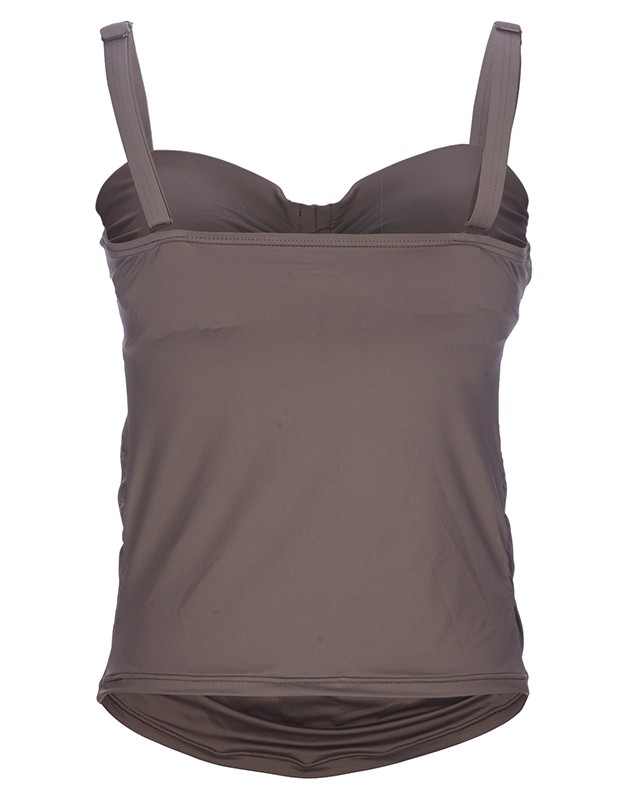 Das Tankinitop ist mit 3-fach verstellbarem Bügel-BH Teil innen ausgestattet bietet durch etwas breitere, verstellbare Träger am Bikinitop ein sehr gutes Tragegefühl. Ein hochwertiges Silikontape liegt innen um die obere Kante des Tankinioberteils und sorgt dafür, dass Nichts verrutscht. Die kunstvolle Raffung im Vorderteil des Tankinitops ist individuell verstellbar durch den Tunnelzug und Bändchen mit Goldperlen. Der Bikinislip ist stufenlos verstellbar durch zum Oberteil passende Bändchen und kommt auch einfarbig in Nougat sehr edel daher. Der Bikinislip sitzt kess und passend auf jeder Hüfte und ist durch den beiseitigen Bänderverschluss ideal für jede Figur.