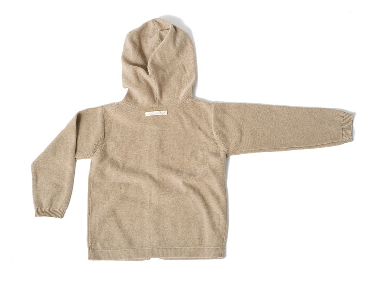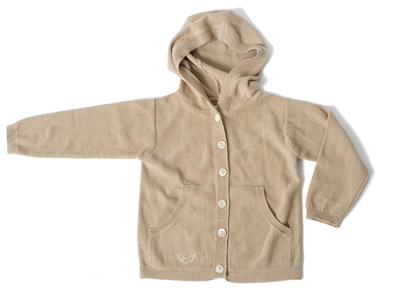 Die 100% Biobaumwolle Kapuzenstrickjacke "Sam" mit Eingrifftaschen verziert mit Perlmuttknöpfen und Stickerei in der Farbe creme.