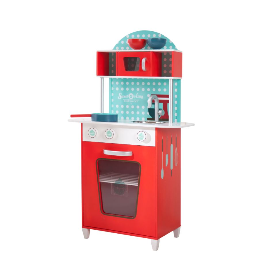 Detailreiche und kindgerechte Spielküche mit Edelstahlspüle und Offen. Auf der Magnetrückwand werden Lieblingsrezepte und Bilder angepinnt. Mit Klick-Klack Sound können die Schalter bedient werden. Mit der Uhr können die Kinder die Backzeit einstellen. Mit Sweet&Easy Küche schult ihr Kind zusätzlich seine motorischen Fähigkeiten und erlernt spielerisch was es in einer Küche so alles zu tun gibt.
