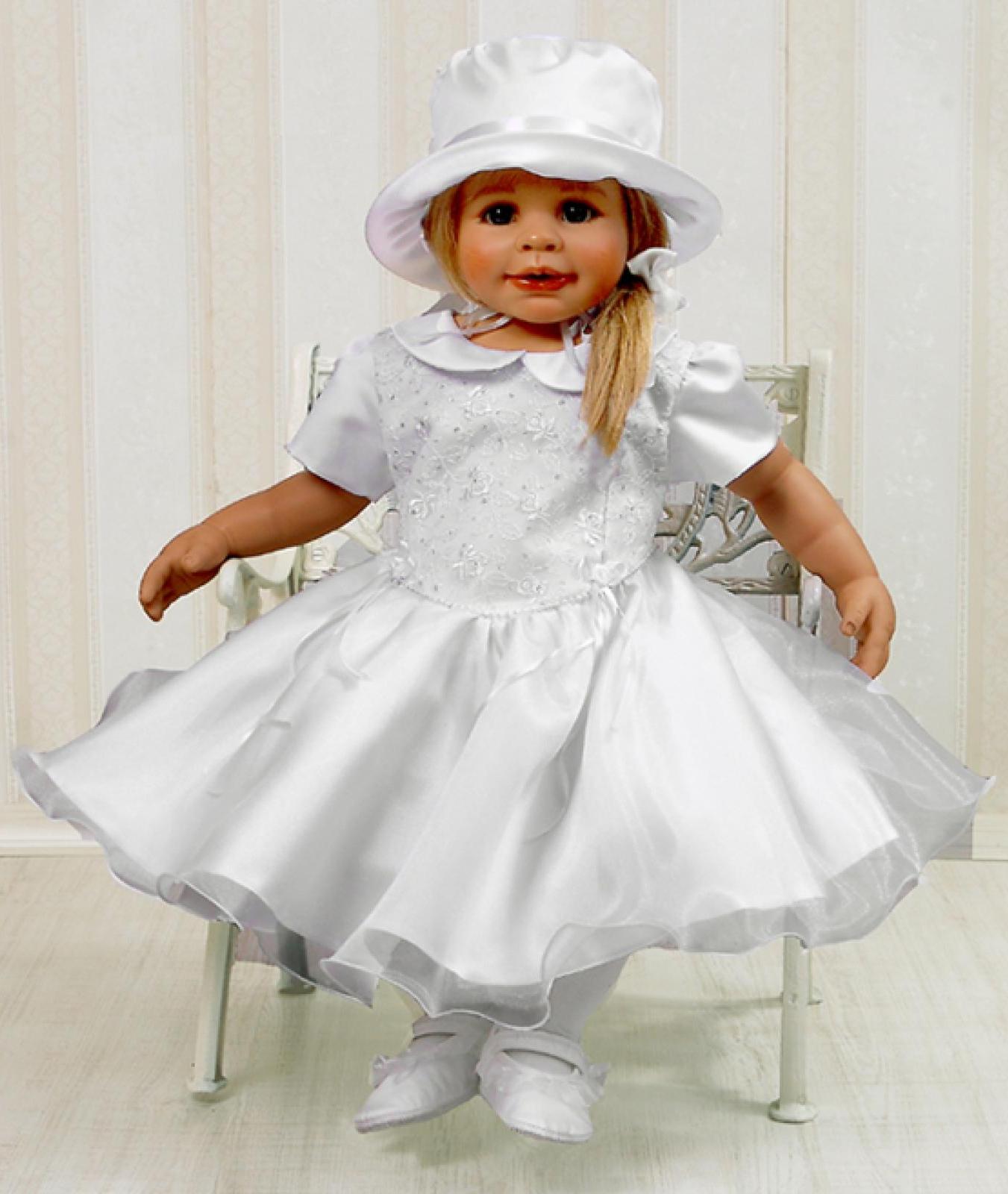 Edles und sehr zeitlos elegantes Taufkleid mit Hut in schneeweiß (ohne Schuhe).