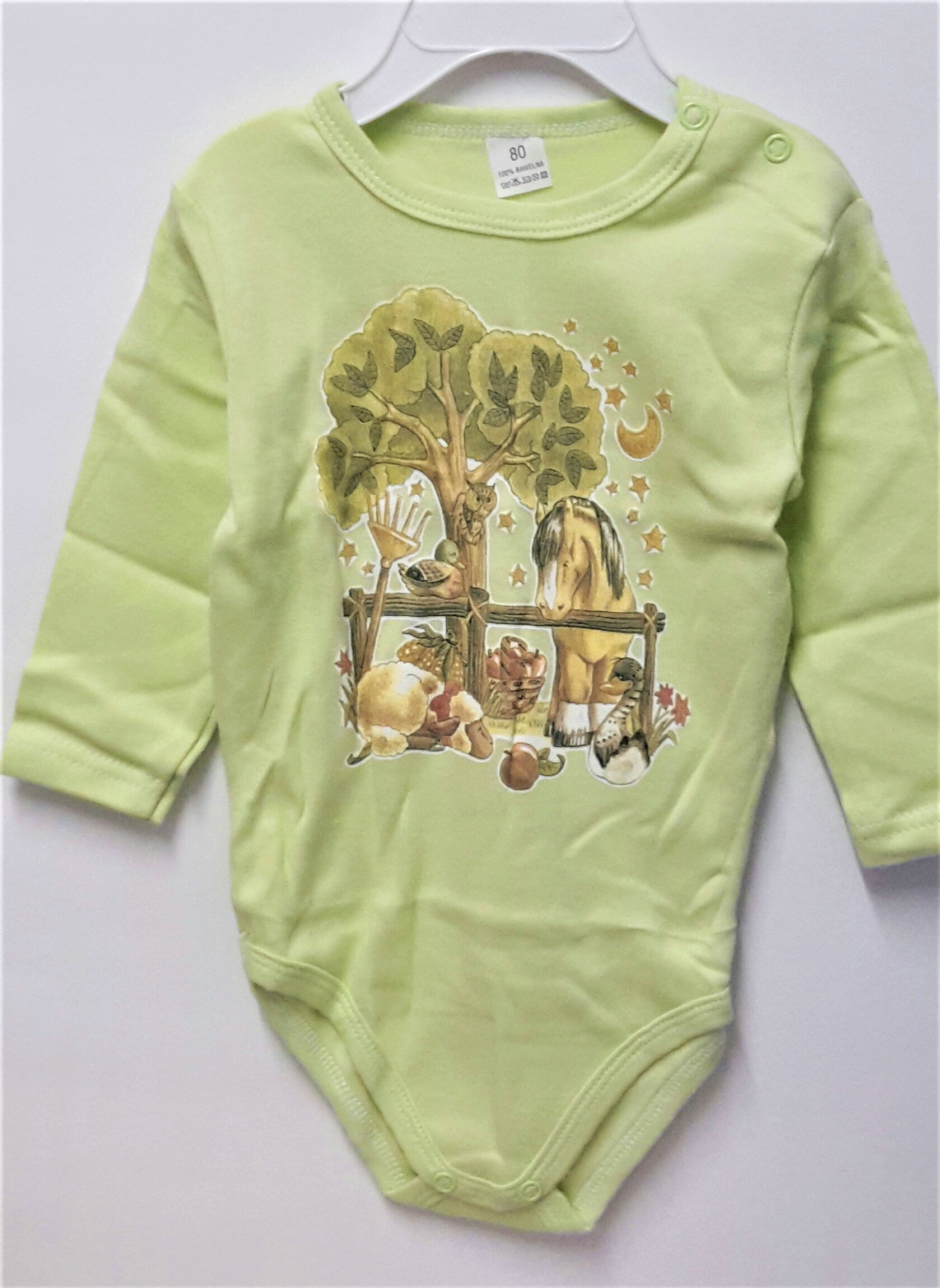Langärmelige Body "Bauernhof" aus weicher Baumwolle.