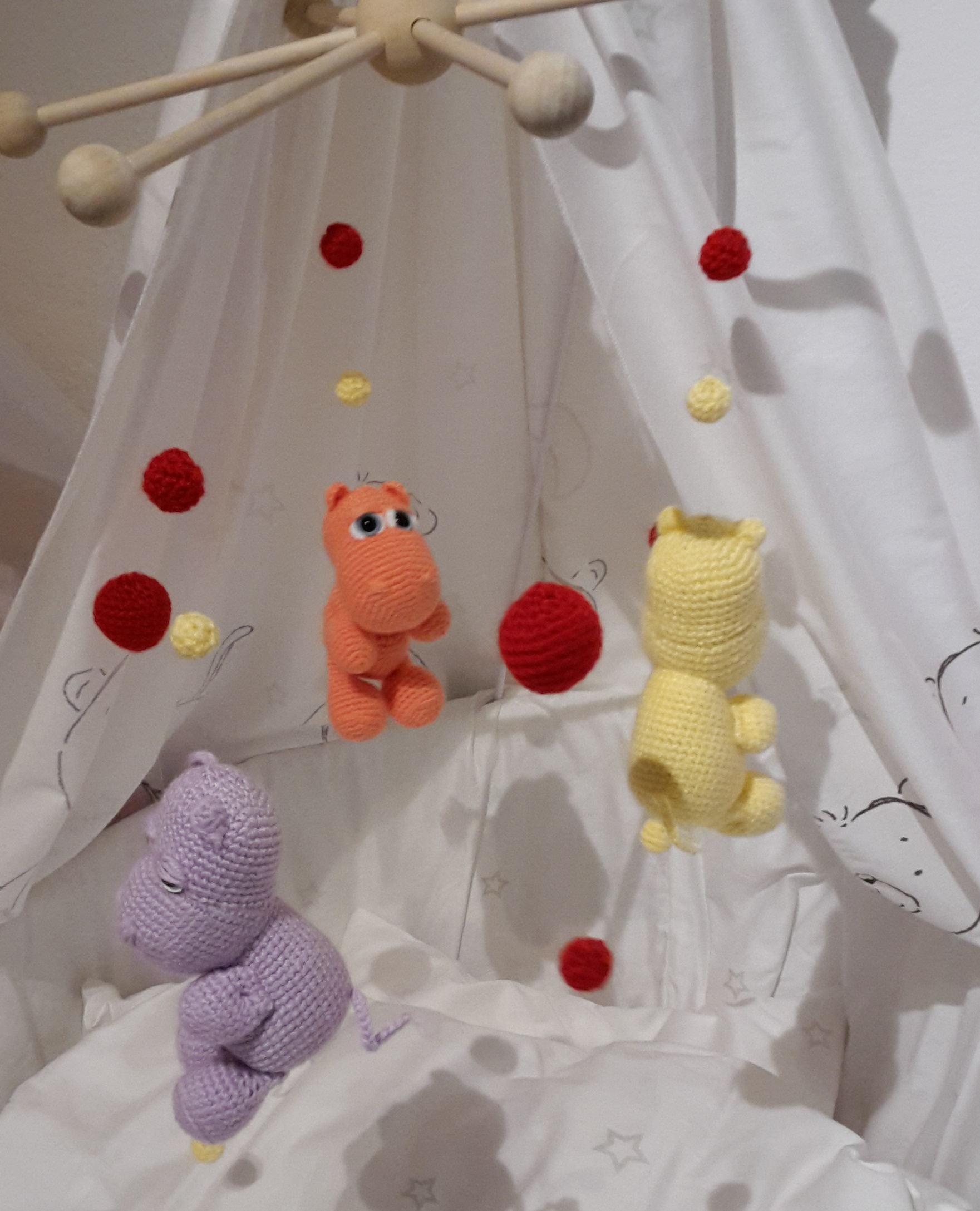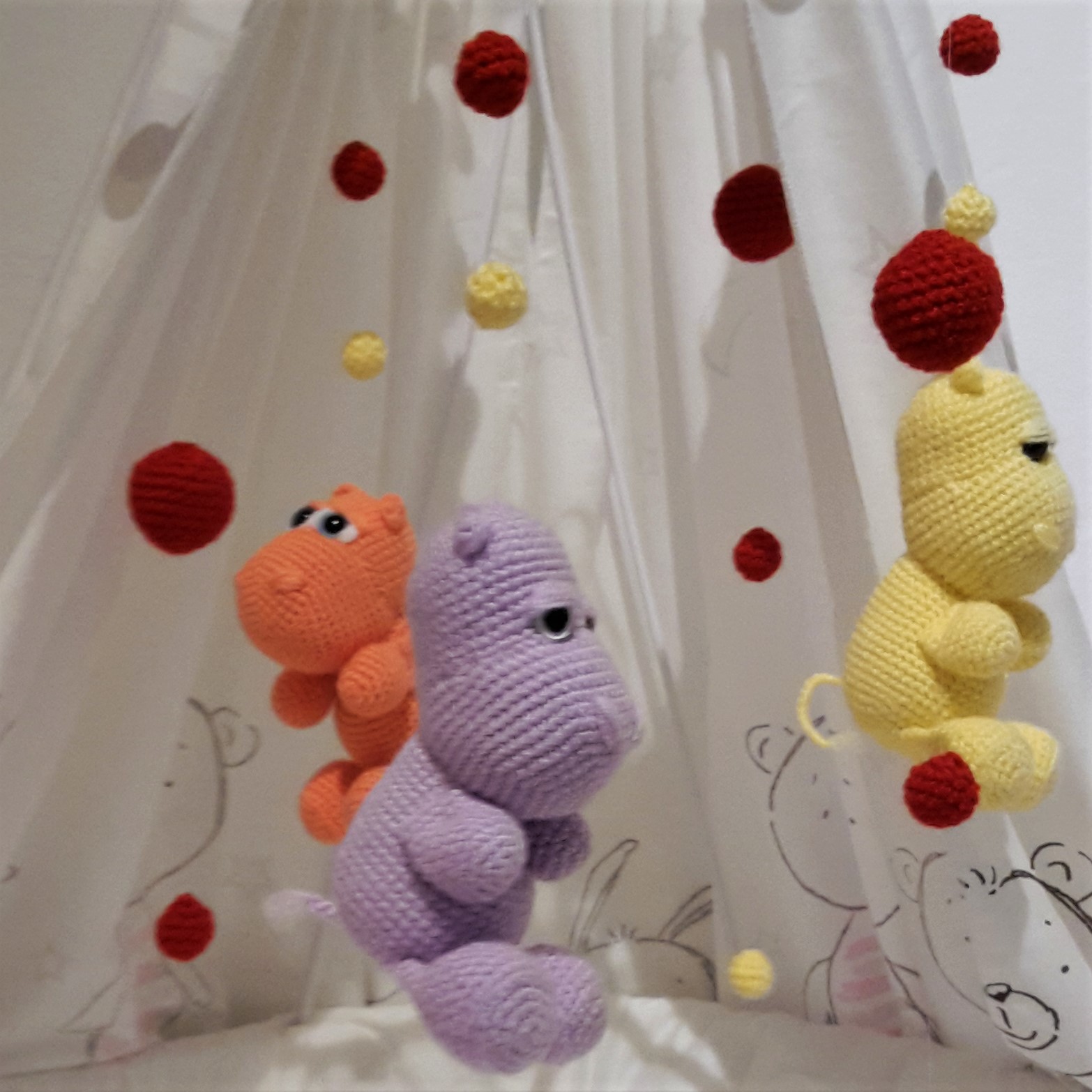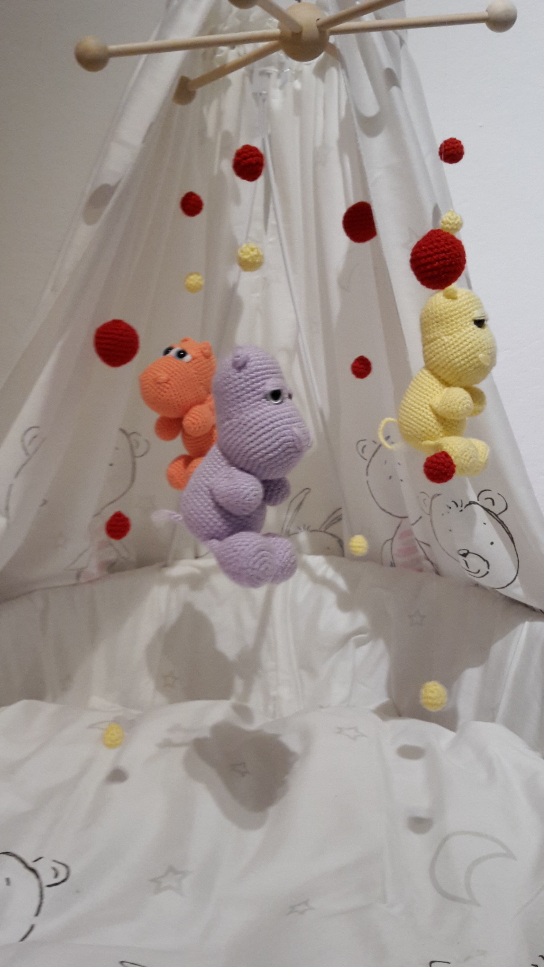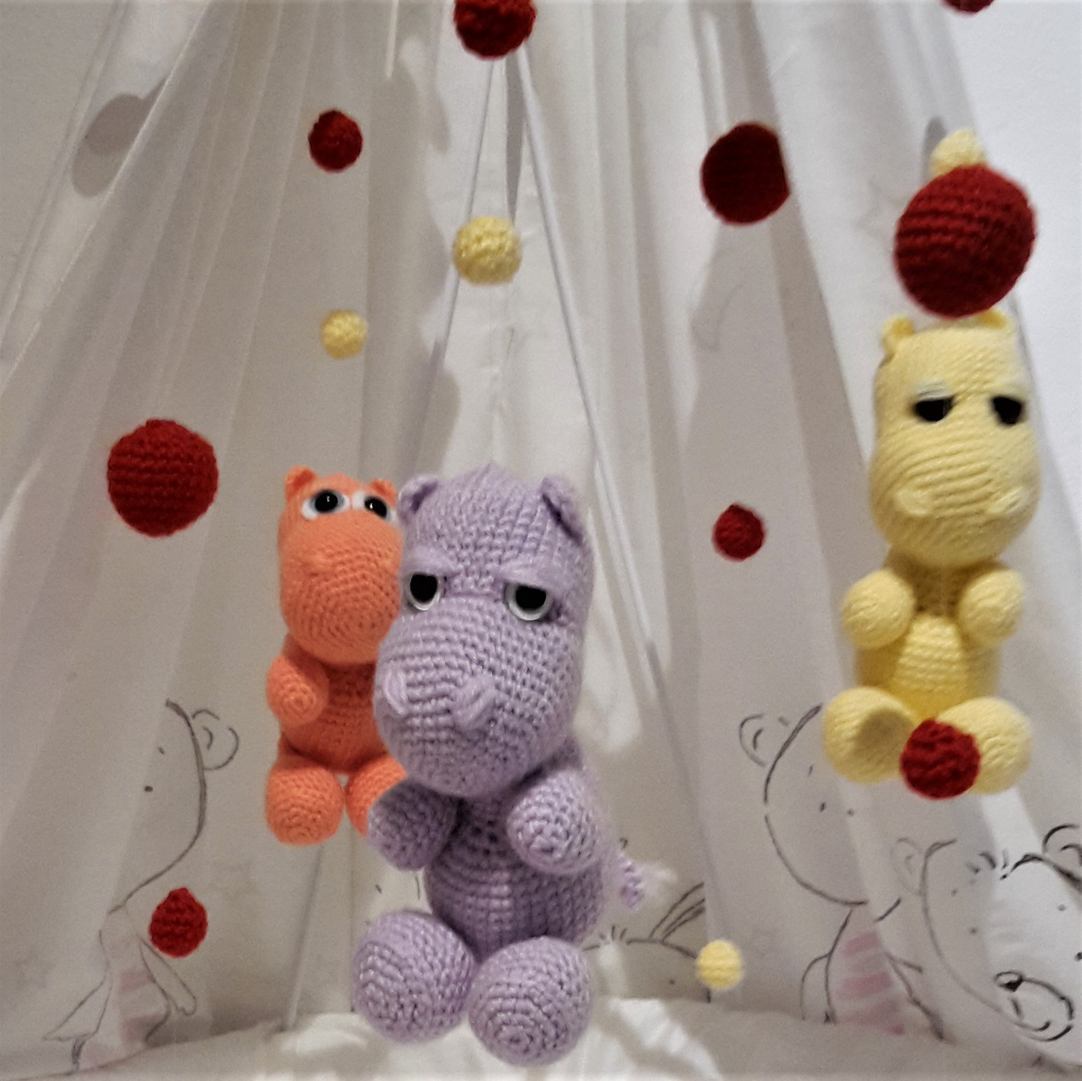 Mit dem Mobile Nilpferdchen von Hand gehäkelt hast Du garantiert ein Unikates Geburtsgeschenk!