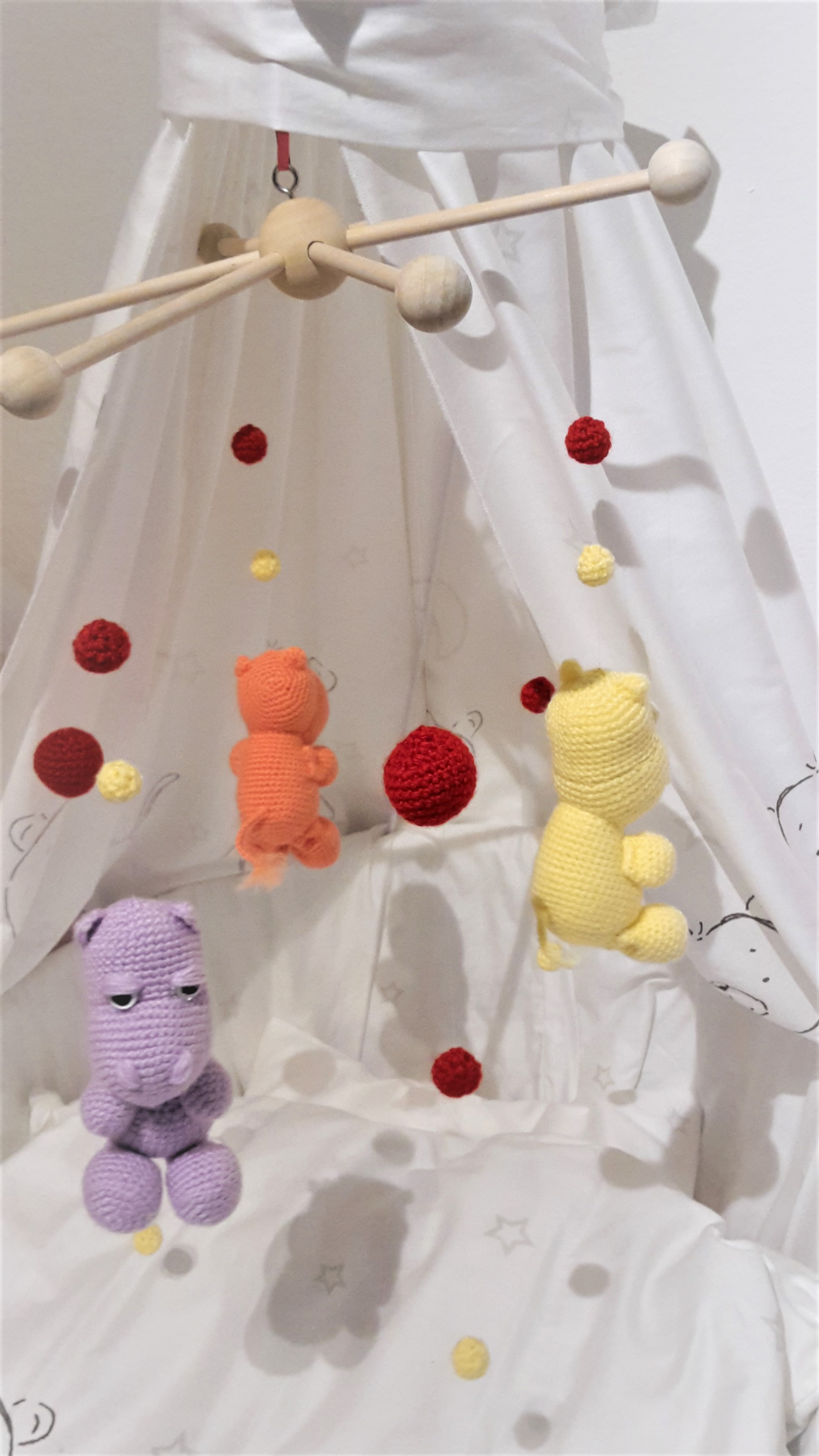 An diesem Mobile baumeln die niedlichen Nilpferdchen, die für spannende Unterhaltung sorgen und begleiten die Kleinen ins Reich der Träume.