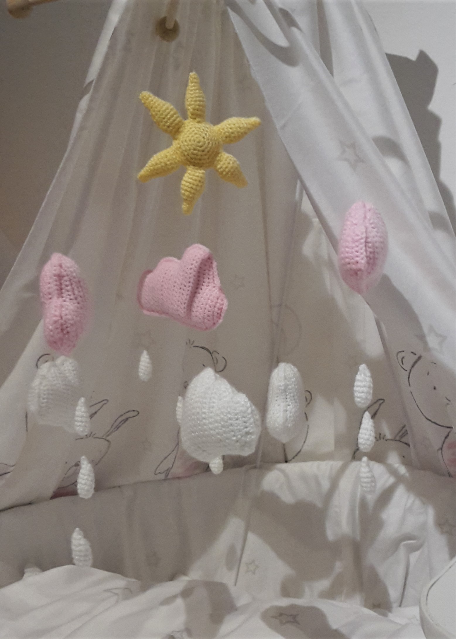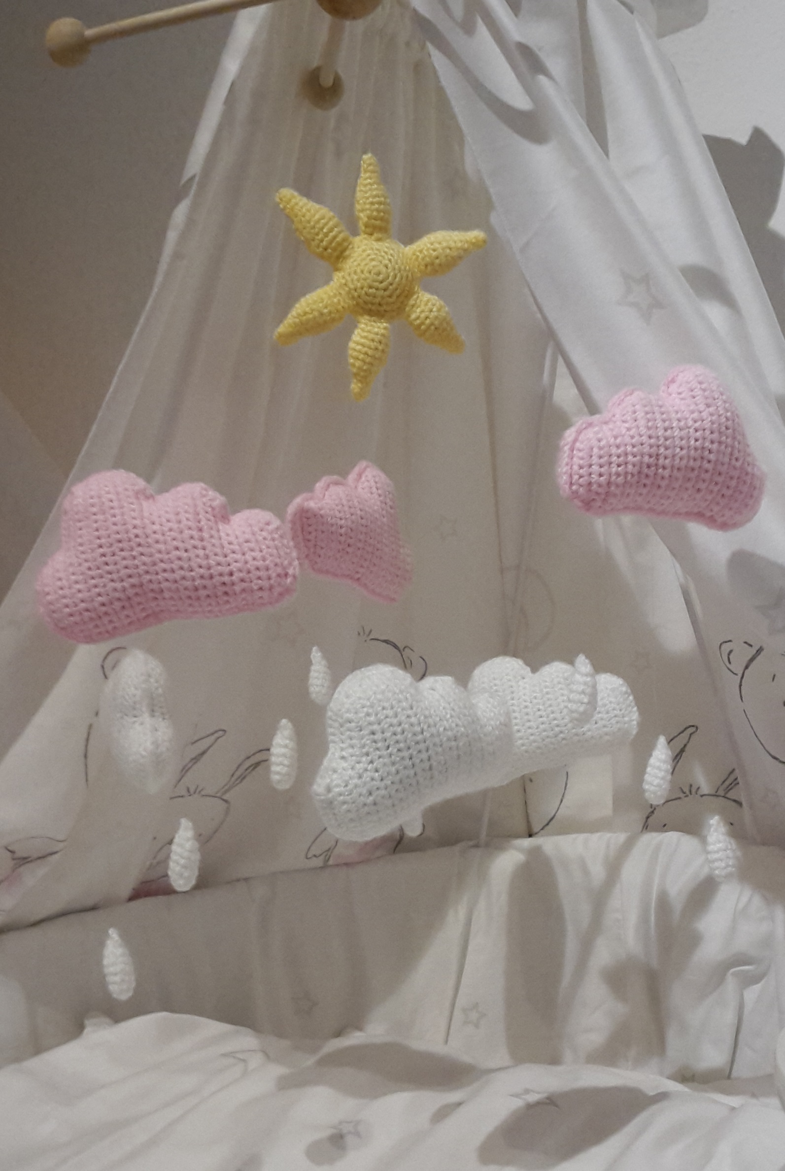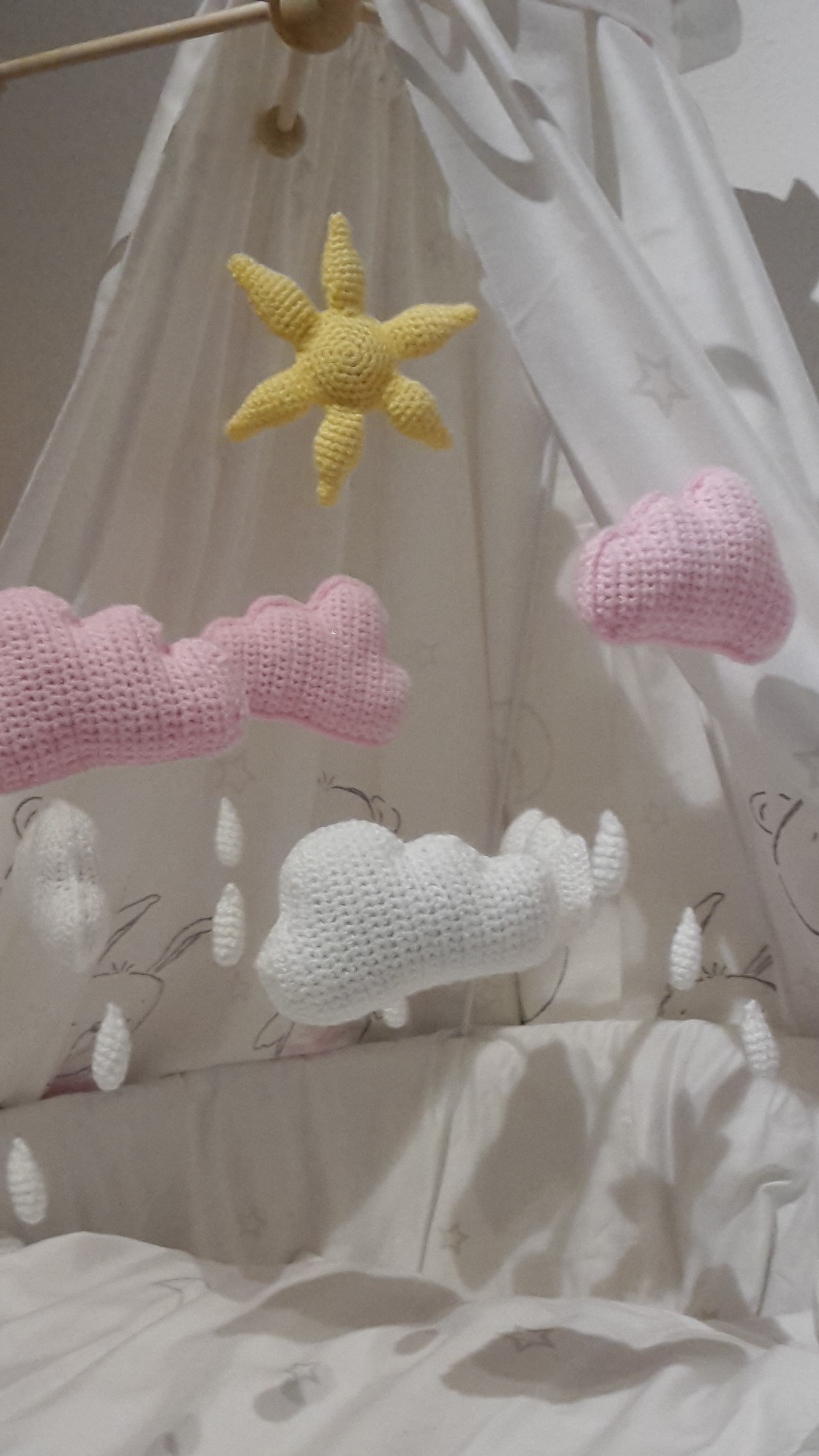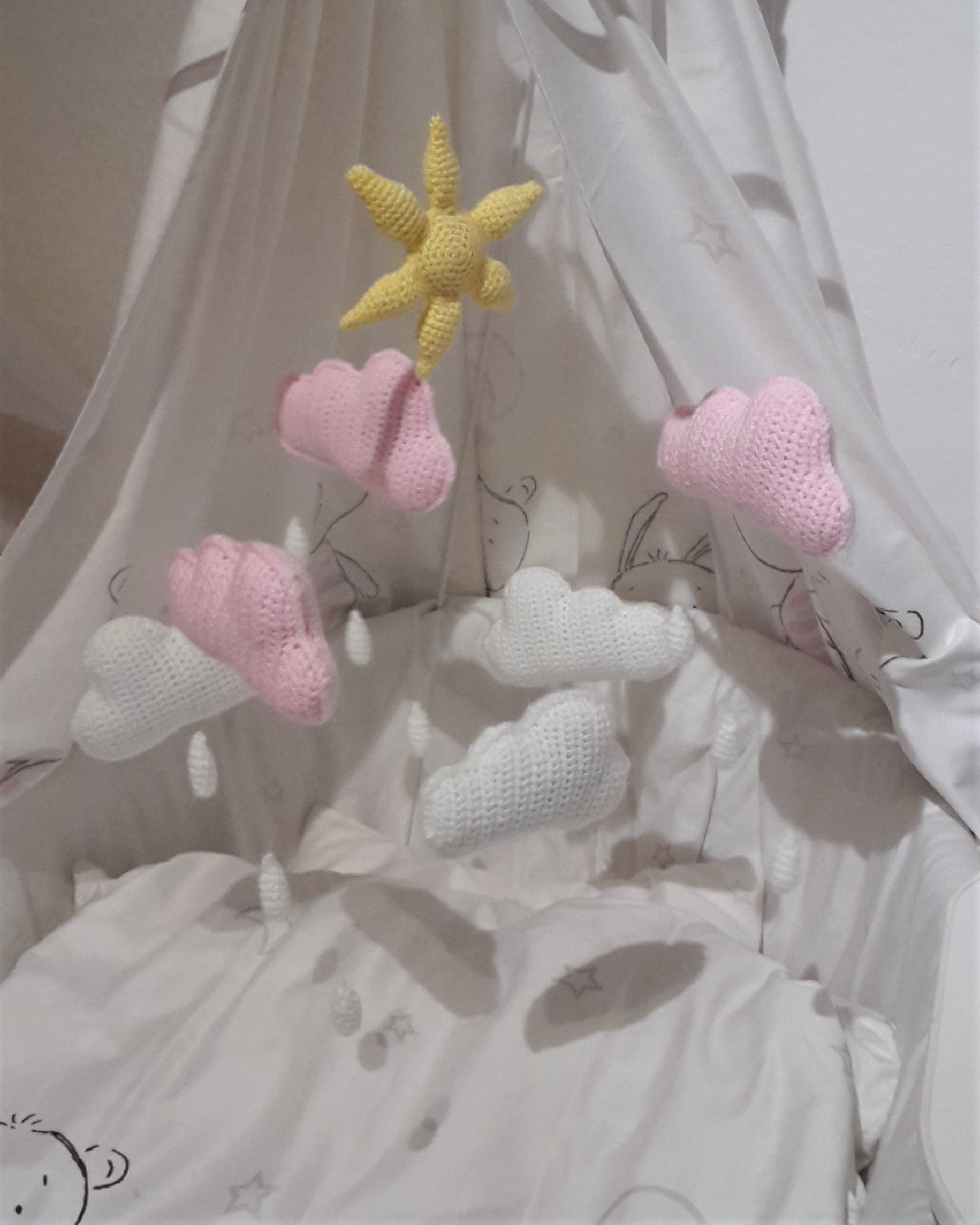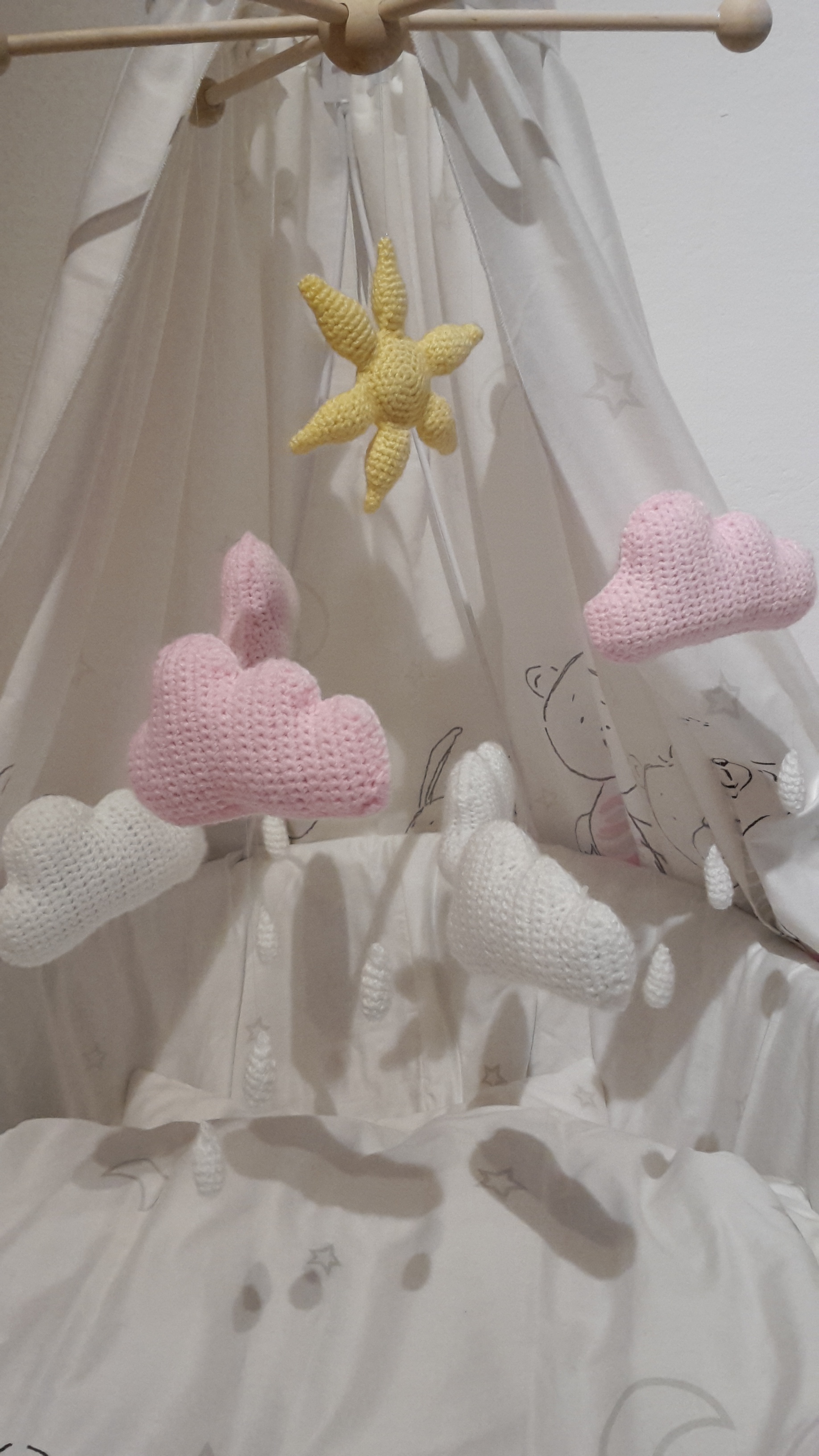 An diesem Mobile baumeln die niedlichen Wolken, die für spannende Unterhaltung sorgen und begleiten die Kleinen ins Reich der Träume.