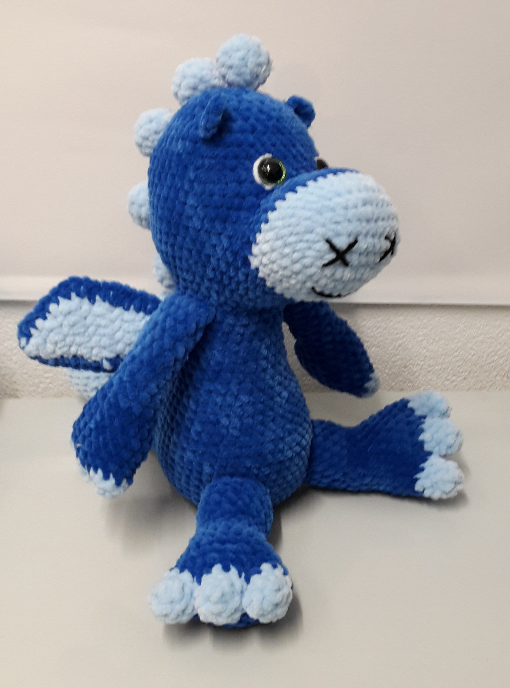 Der drollige Häkel-Drache ist ca. 30 cm in Sitz-Position und wartet nur darauf geknuddelt zu werden.