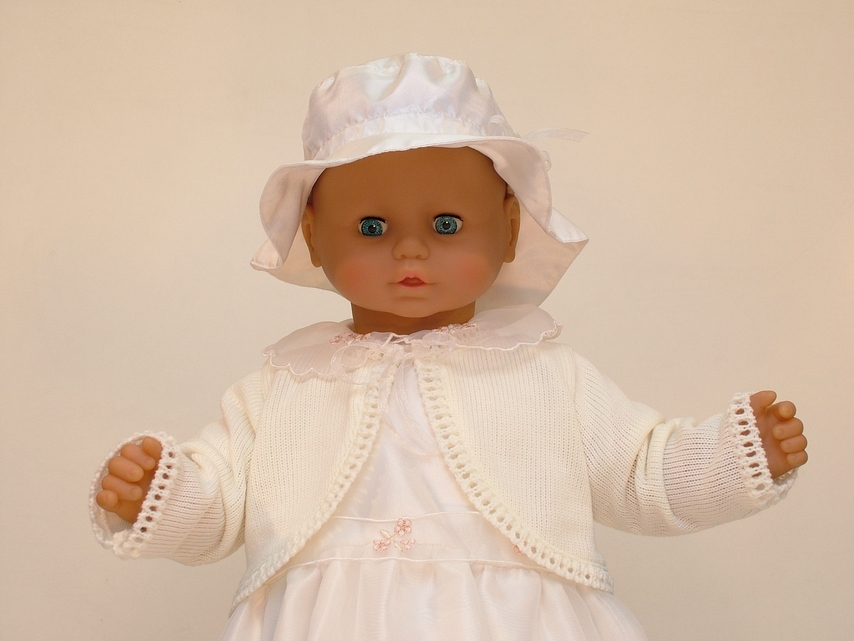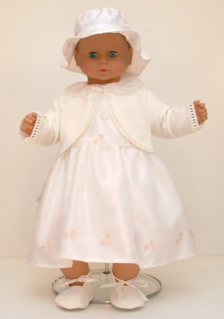 Weisses KurzärmligesTaufkleid mit Hütchen (ohne Schuhe) und Strickjäckli.
