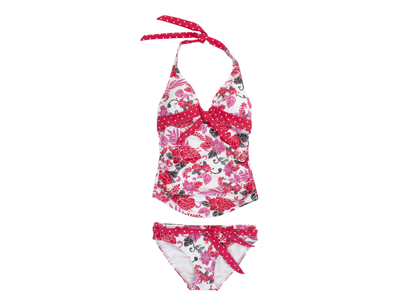 Tankinioberteil aus hochelastischer, weicher Qualität schön bedruckt mit Hawaiiblumenmuster in pink-rot-braun auf weiß mit stufenlos verstellbaren Trägern und herausnehmbaren Polstern. Weisse Punkte auf pinkrotem Grund als Gürteleinsätze zum Knoten geben jedem Dekolletée den individuellen Touch. Ein passender Bikinislip mit Gürteldetail zum Binden rundet das Ensemble ab.