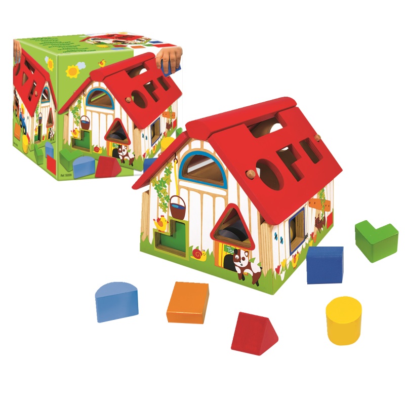 Das wunderschöne Holzhaus vereint hohen Spielwert mit dem Erlernen von geometrischen Formen und Farben.