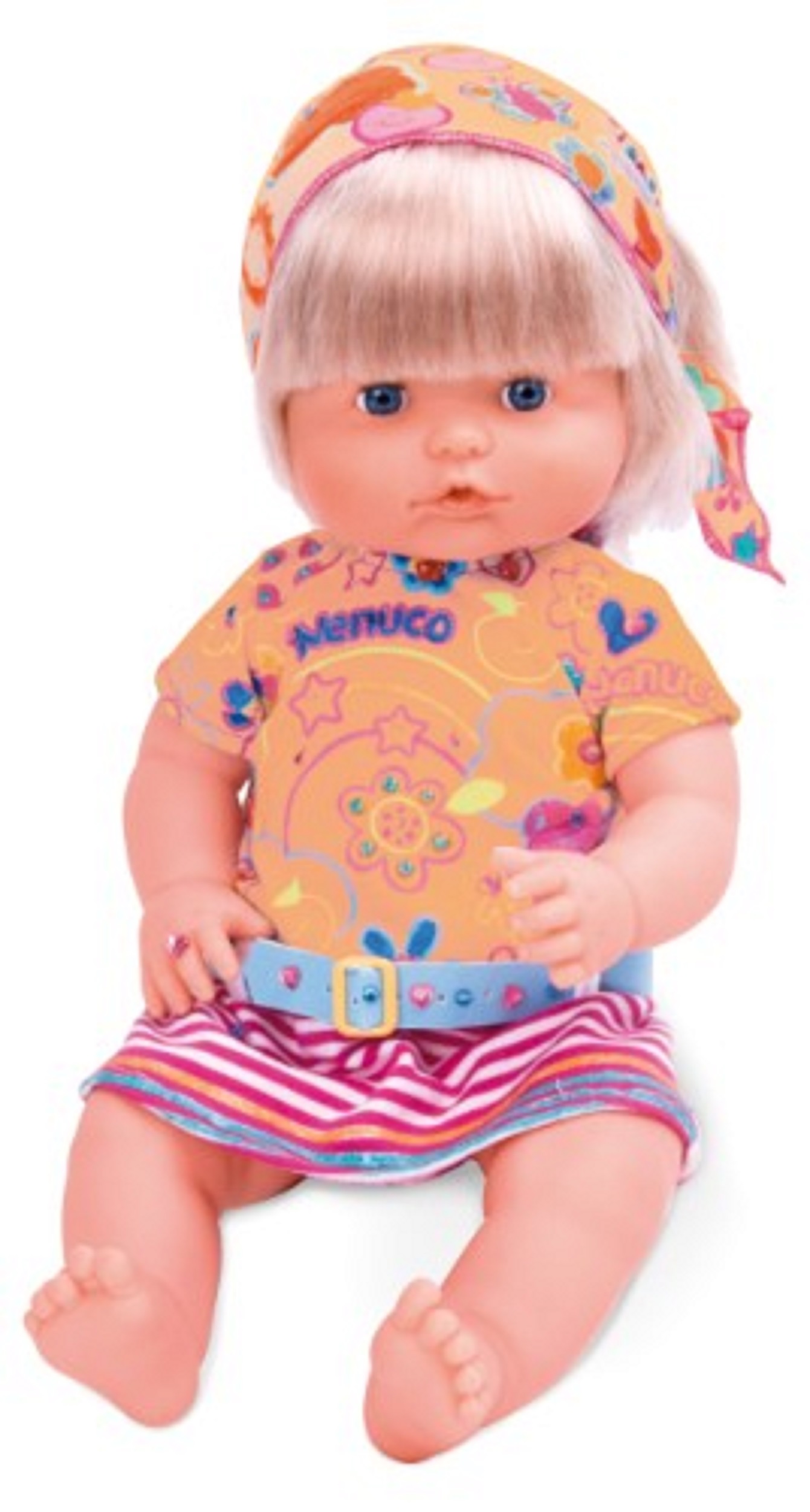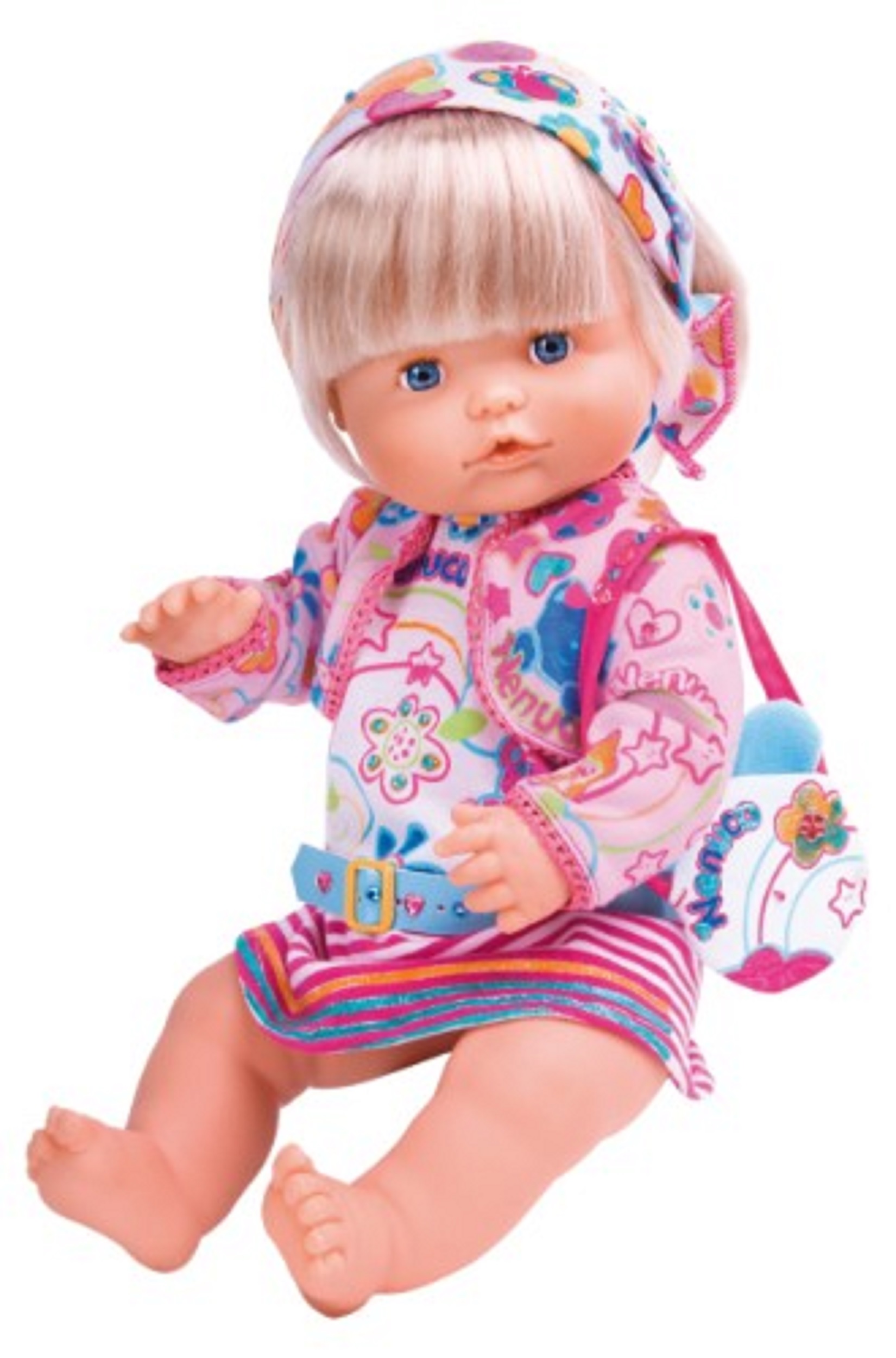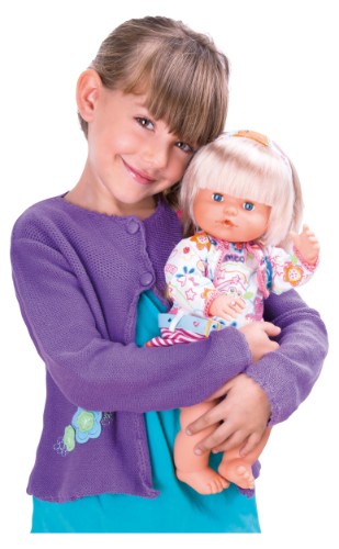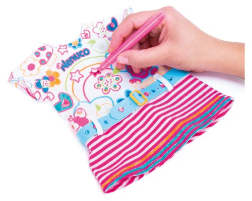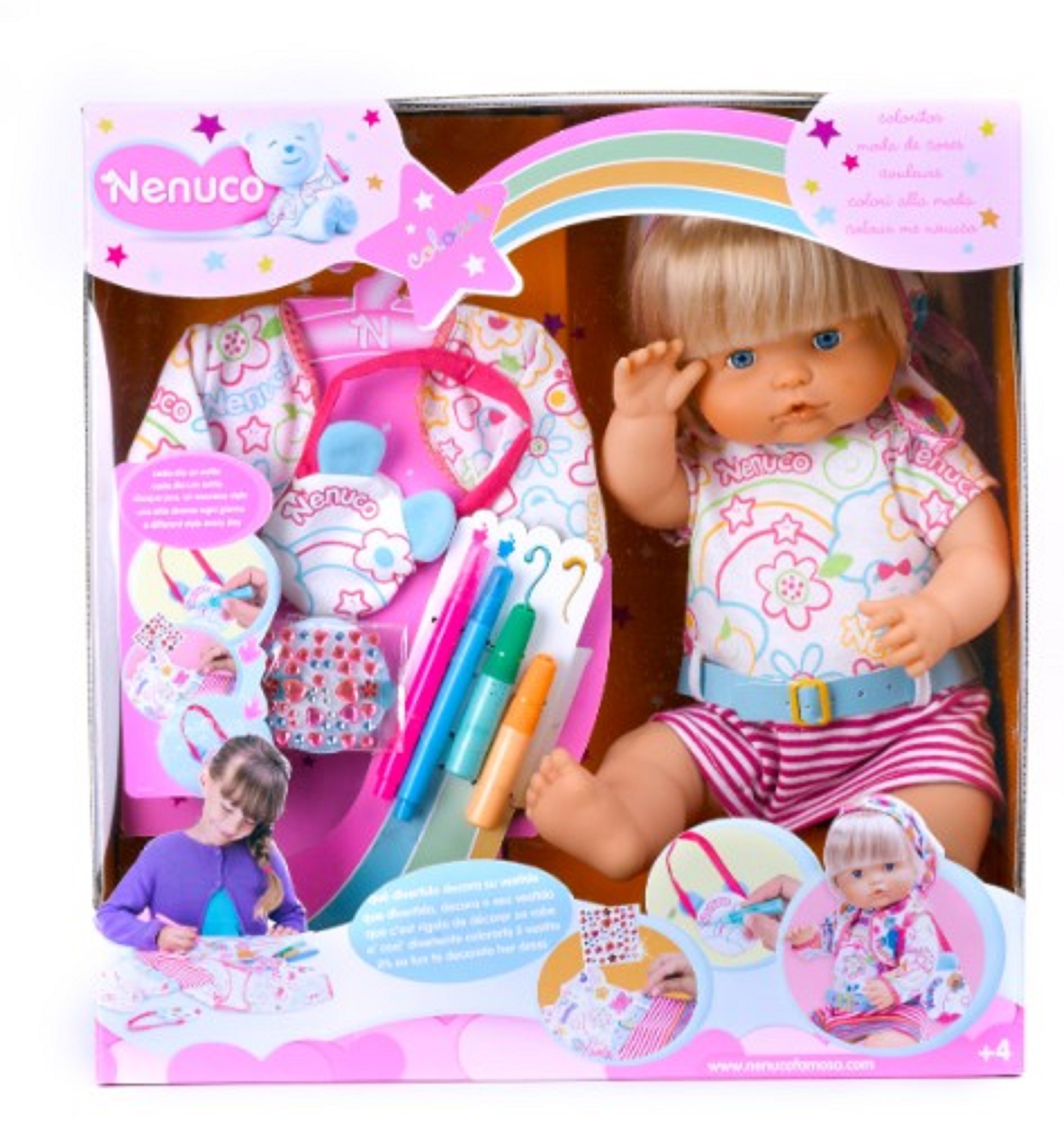 Hier können Puppenmamas kreativ werden! Puppe Nenuco hat bemalbare Kleidung, die immer in den Farben strahlt, die das Mädchen gerade am schönsten findet. Mit zwei Malstiften und zwei Gelstiften mit Glitter- oder Perleffekt können Jacke, Hemd und Tasche verziert werden. Wenn das Design dann überholt werden soll, ist das kein Problem: Einfach auswaschen und das Malen kann von neuem Beginnen. Als Highlight kann der Gürtel noch mit bunten Steinen besetzt werden. Die süße Nenuco Puppe mit ihren hübschen blonden Haaren und blauen Augen sieht in diesen tollen selbst ausgedachten Outfits direkt noch mal so gut aus.