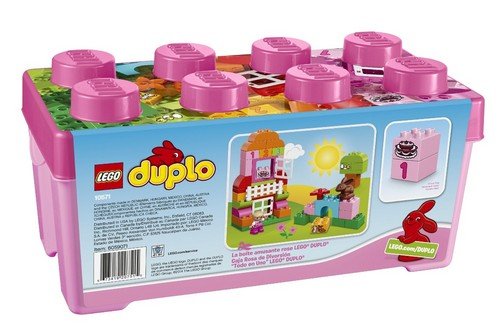 Zum Set gehört auch eine robuste rosa Aufbewahrungsbox in der Form eines klassischen LEGO Steins. Enthält eine DUPLO Mädchenfigur.