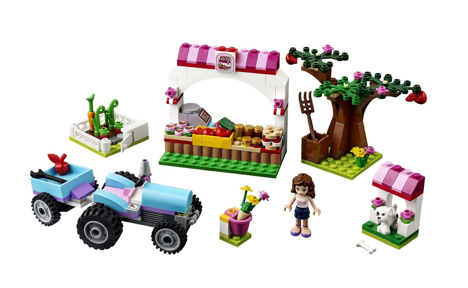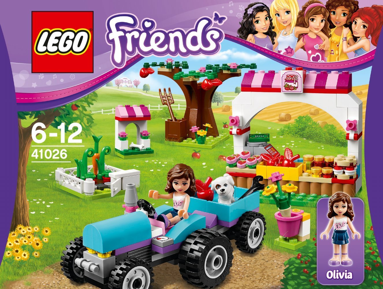 Hilf Olivia in ihrem Gemüsegarten! Pflücke die Äpfel vom Baum und bringe sie zusammen mit den Karotten aus Olivias Garten zum Marktstand. Belade den Anhänger und mach ihn am Traktor fest. Am Markt angekommen, könnt ihr das Obst und Gemüse zum Verkauf auslegen. Kümmere dich um das zutrauliche Hündchen Charlie, das aus seiner Hütte gelaufen kommt, um jeden Kunden persönlich zu begrüßen. Enthält die Spielfigur Olivia und ihren Hund Charlie.