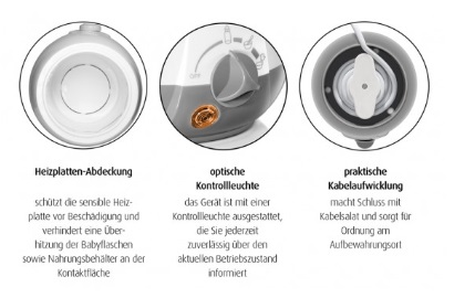 - erwärmt Milch in 6 - 8 Minuten, Babynahrung in 8 - 10 Minuten