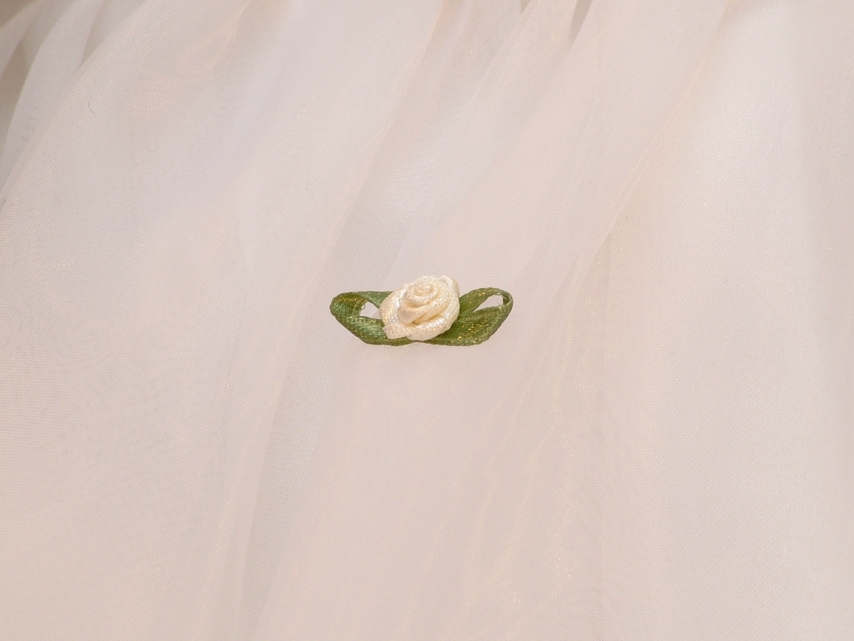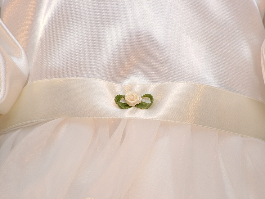 Wunderschön verarbeitete in perfekt weiss Satin Taufkleidchen mit Hütchen. Langärmlig, sehr dekorativ (am unteren Teil mit zahlreichen Blumen). Perfekte Paßform dank Schleife. An der Rückseite des Kleidchens befindet sich ein Reißverschluss.
